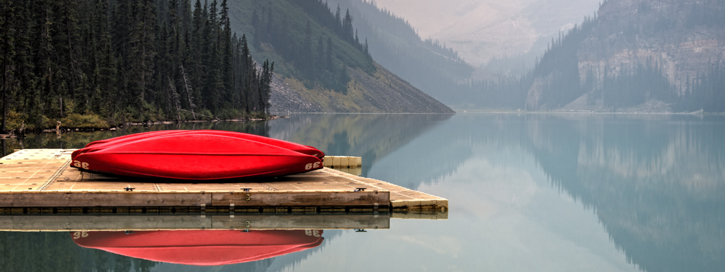 red boat on lake mountains in background