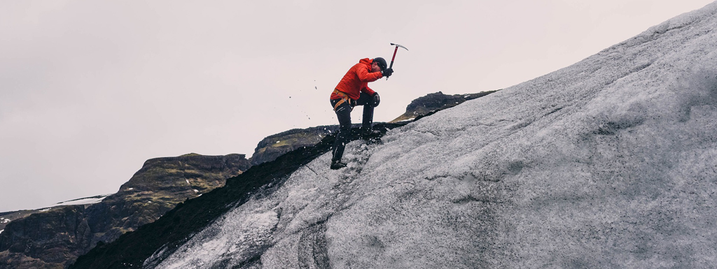 picture showing a mountain climber hacking ice from a mountain visualizing the case study for PORR AG