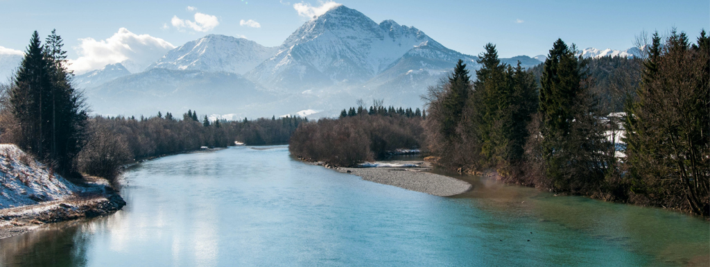 Fluss durch Alpenregion in Winterlandschaft bei Sonnenschein