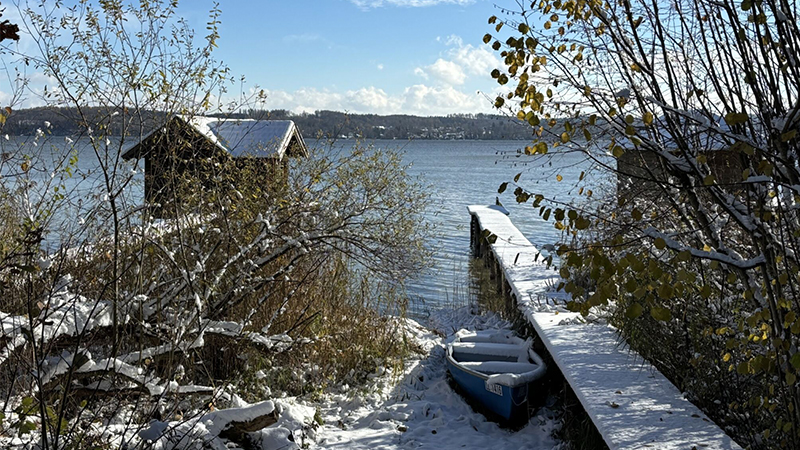 Seeufer mit Steg, Bootshaus und Schilf unter Schnee